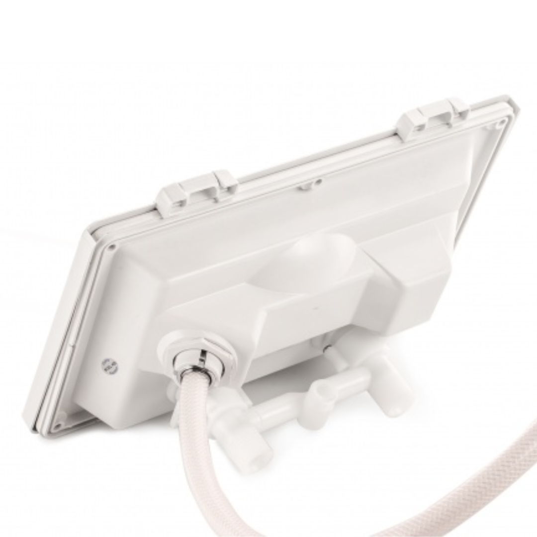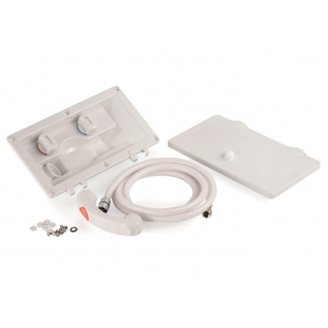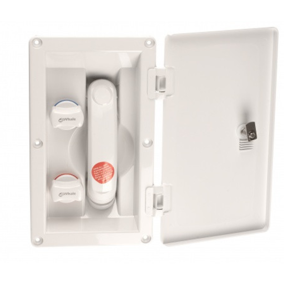 Whale's high-quality complete built-in shower enclosure includes a built-in enclosure, a dual mixer tap for hot and cold water, a hand shower, a rectangular door, a 2.10 m mesh hose, gaskets, and mounting screws. Designed for marine use, ideal for external transom shower systems on boats.