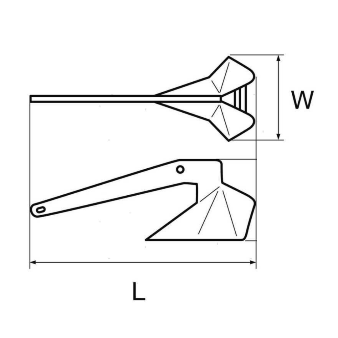 | Peso ancora (kg) | Imbarcazione (in metri) | L (cm) | W (cm) |