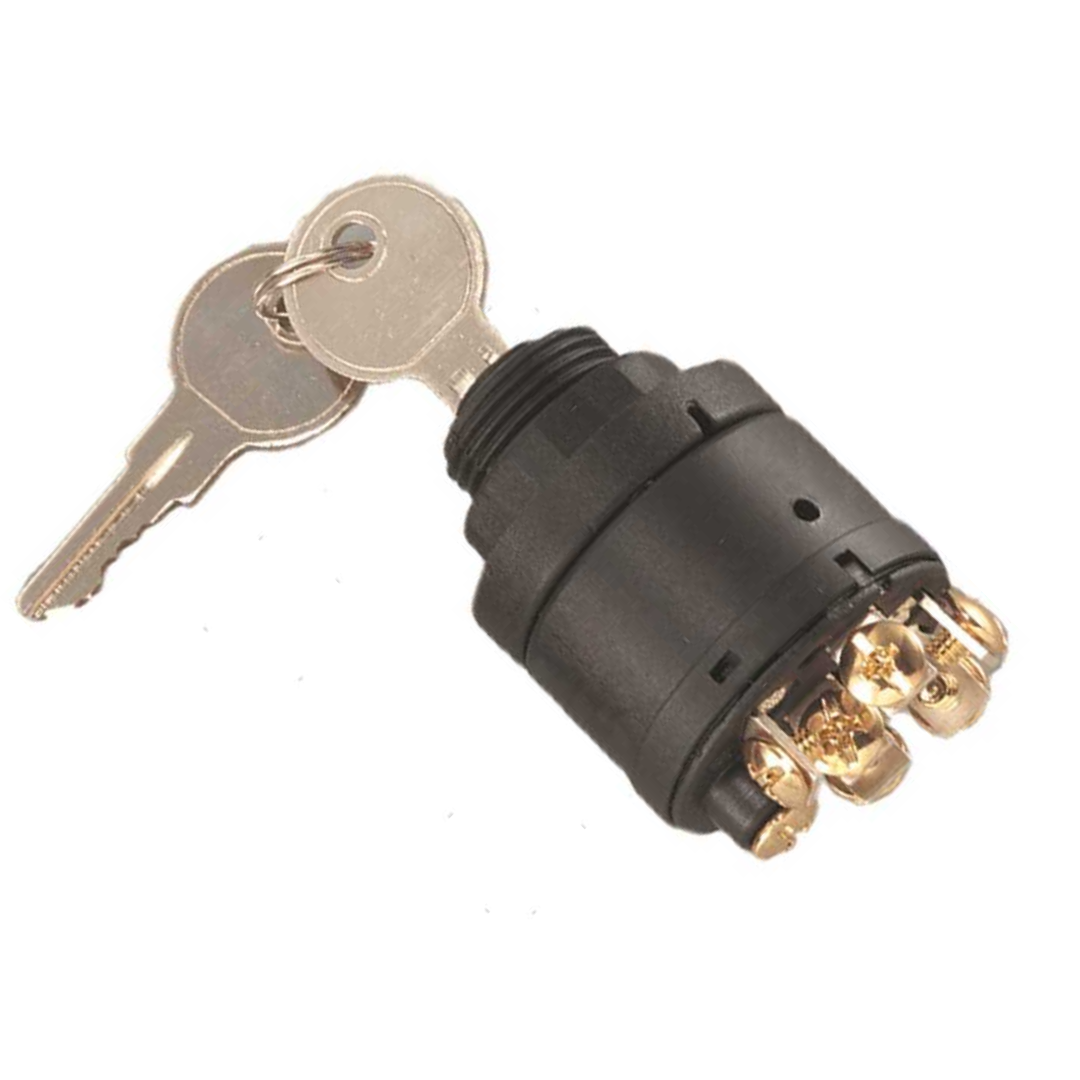 Blocchetto di avviamento per motori a benzina. Impermeabile per installazioni marine. Completo di cappuccio esterno in gomma e coppia di chiavi uguali. 4 posizioni (servizi - OFF - .ACC - START), 7 terminali di collegamento.