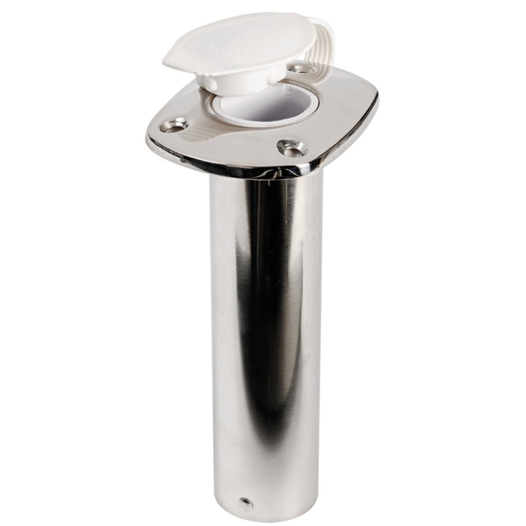 Portacanna verticale per canne da pesca costruito in acciaio inossidabile con una boccola interna in PVC morbido e un cappuccio terminale impermeabile. Montaggio a incasso su murata o ponte in barca.