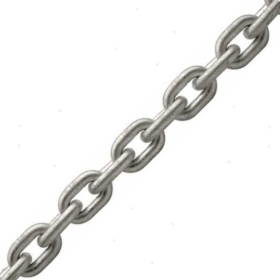Catena calibrata in acciaio zincato a caldo per uso sui verricelli e salpancora, DIN 766, produzione controllata e carico di rottura elevato.
