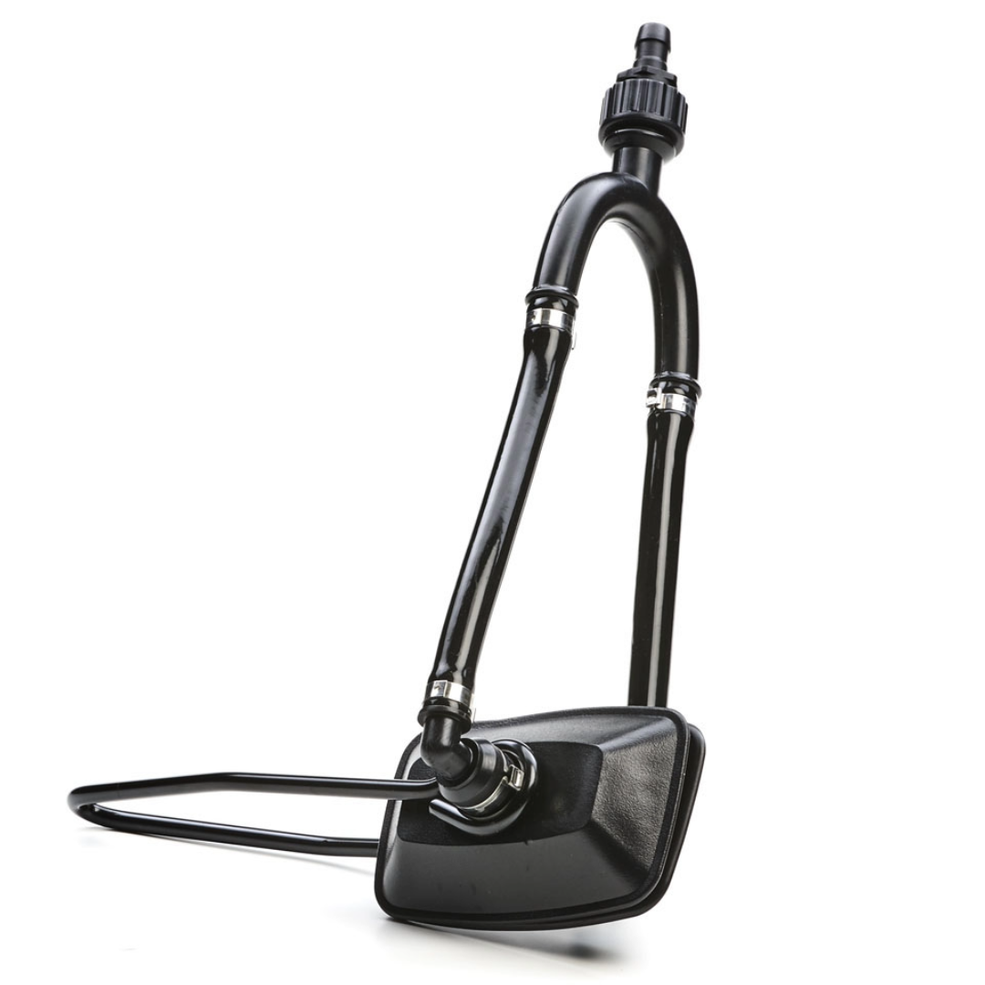 La cuffia lavaggio motori fuoribordo con tubo è l'accessorio perfetto per la pulizia dei motori fuoribordo a terra. Grazie all'innesto rapido per tubo dell'acqua, tipo giardinaggio, potrai collegare facilmente il tuo tubo dell'acqua e iniziare a pulire. La forcella in acciaio verniciato e le ventose in gomma garantiscono una presa stabile e sicura. Modello grande anche per motori fuoribordo di alta potenza.