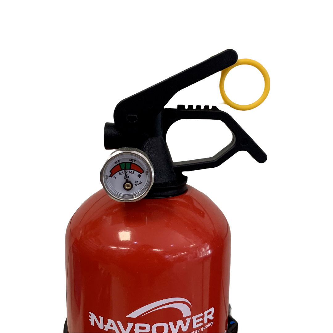 Estintore con supporto rimovibile e manometro che ne indica la carica e data di produzione punzonata.