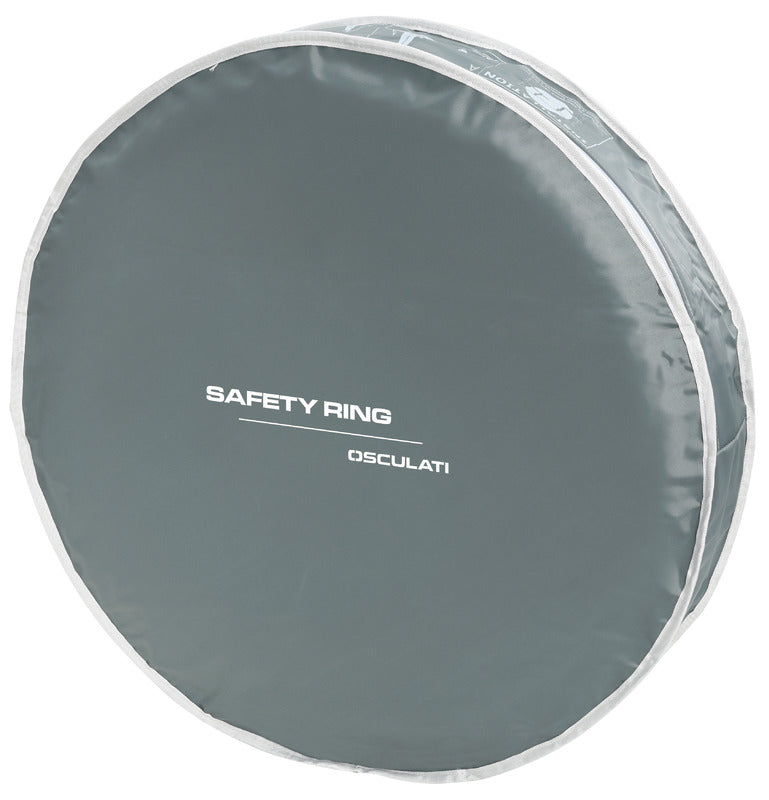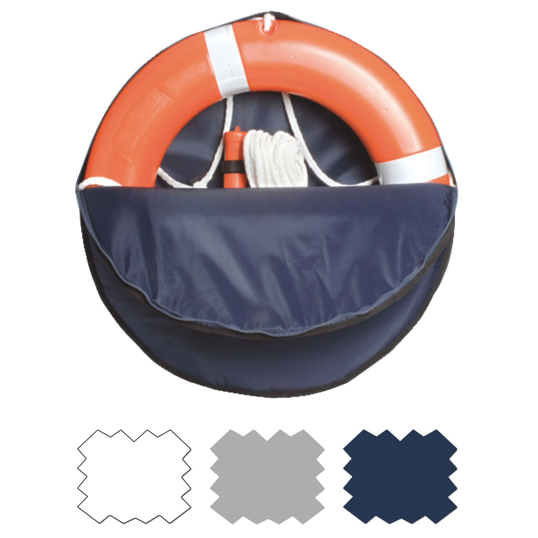 Custodia porta salvagente anulare tondo realizzato in tessuto spalmato in poliuretano a doppio strato con imbottitura protettiva. Dotato di cinghie regolabili per il fissaggio al pulpito e apertura con cerniera per un accesso rapido. All’interno sono presenti fasce elastiche per il contenimento della boetta luminosa e della cima di sicurezza regolamentare.
