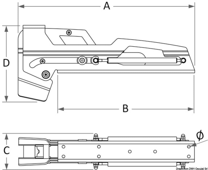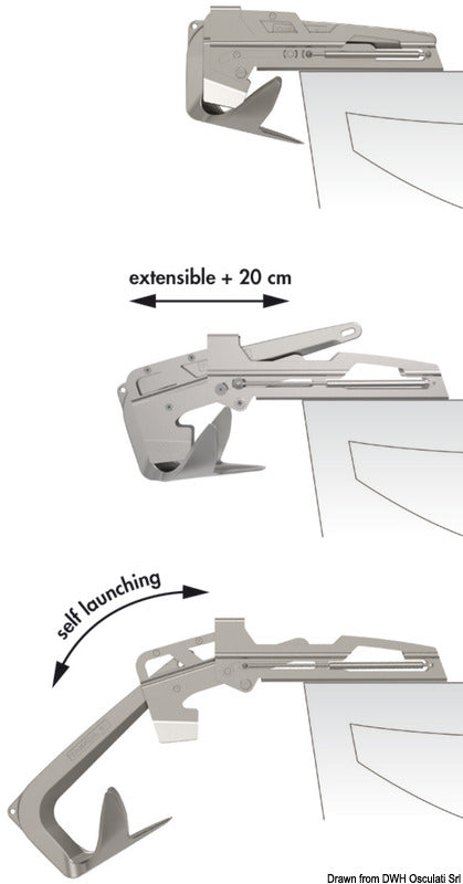 Musone completamente in acciaio inox 316 lucidato a specchio, con sistema automatico di salpa ancora, un gruppo pneumatico allontana l'ancora dalla prua della barca. Contemporaneamente un movimento verso il basso permette la caduta automatica dell'ancora, mantenendo una distanza di sicurezza dalla prua.