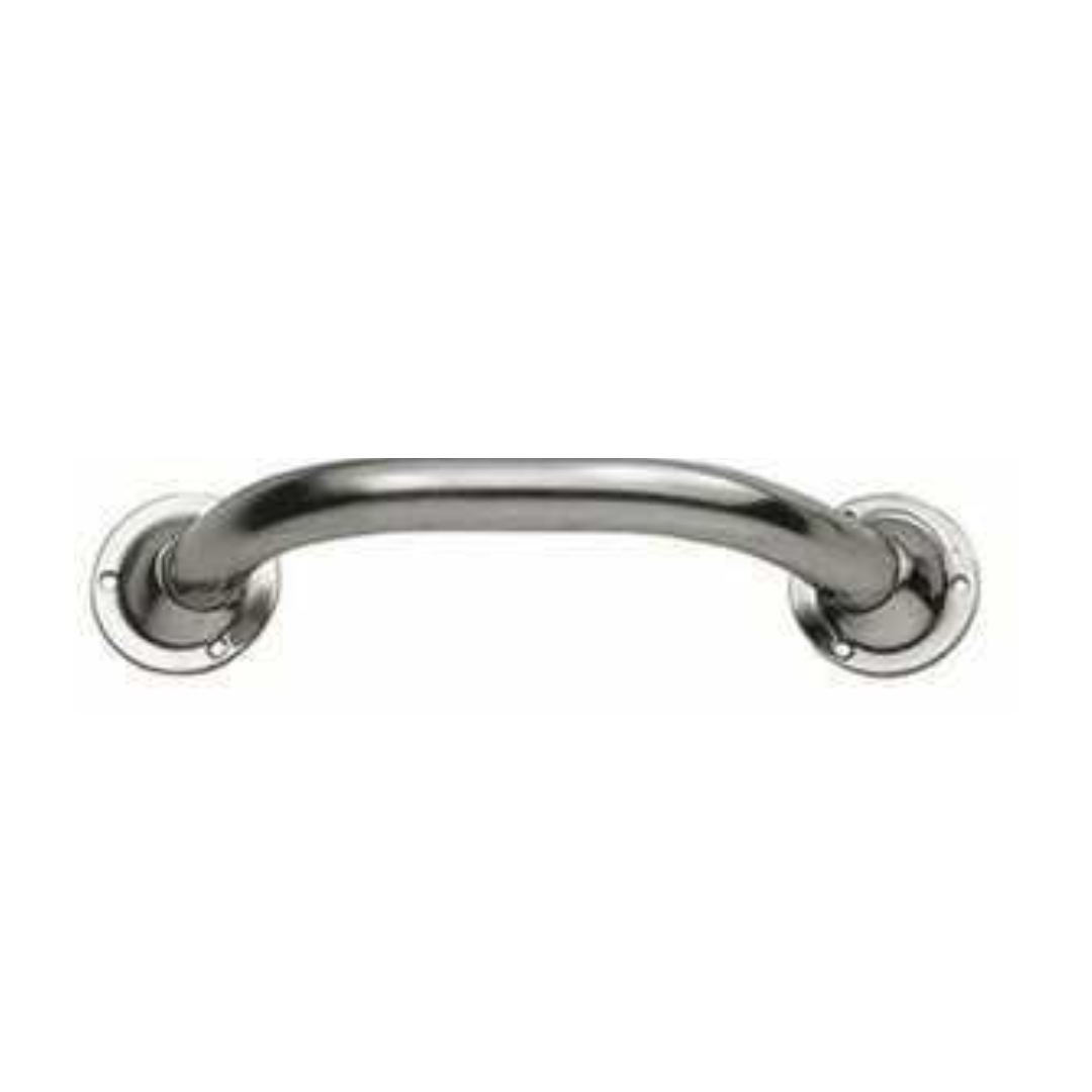 Corrimano tientibene in acciaio inox 316 con basi di montaggio circolari a tre fori esterni. Altezza 80 mm, tubo da Ø 22 mm, lunghezza 250 mm.