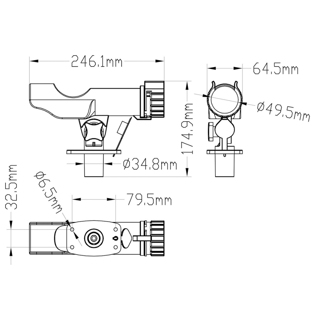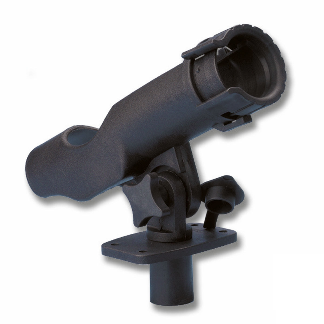 Portacanna orientabile ad incasso in plastica riforzata nera. Grazie al suo design orientabile, è possibile regolare la lunghezza desiderata. Realizzato per l'incasso del porta scalmi. Foro da 40 mm per adattarsi a qualsiasi canna da pesca. Anello rotante con bloccoper orientarlo in qualsiasi posizione.