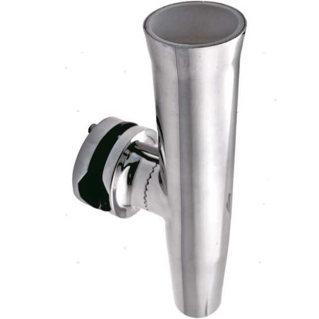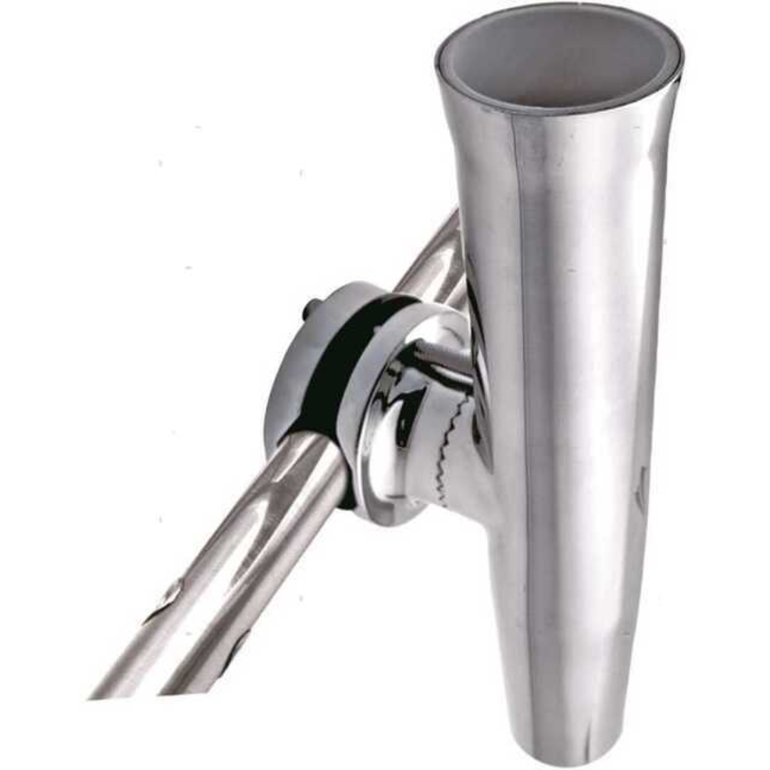 Portacanna orientabile sia in angolazione perpendicolare sia in rotazione a 360°. Fabbricato in acciaio inox con rivestimento interno in Nylon anti usura. Fissaggio con morsetto stringitubo e boccola in gomma a protezione del manico della canna.