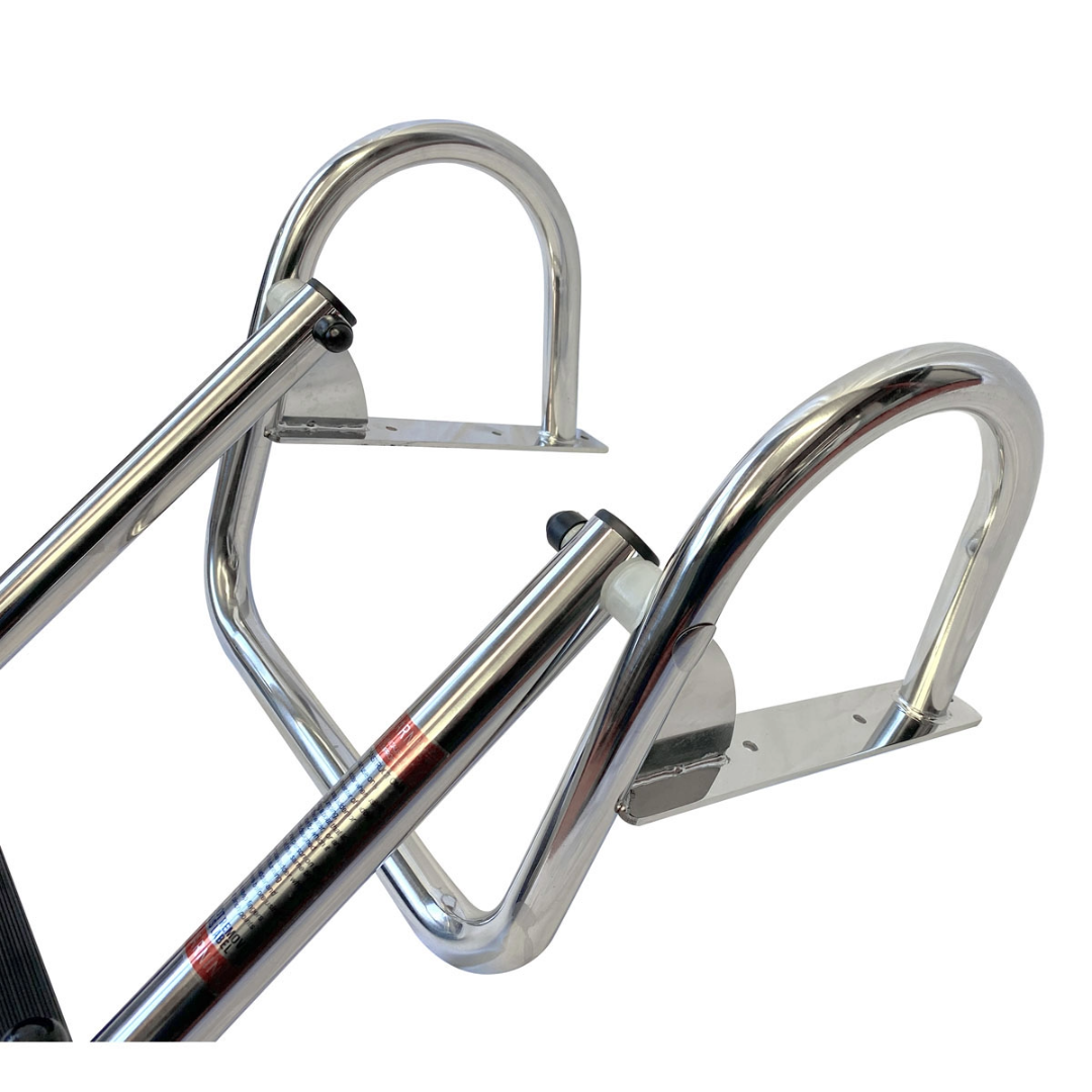 Scaletta telescopica in acciaio con comodi corrimano per facilitare la salita in barca, 4 scalini rivestiti con antiscivolo bianchi. Fabbricata in acciaio inox 316 con tubolari per la massima solidità e resistenza agli agenti marini. Ideale per plancette di poppa.