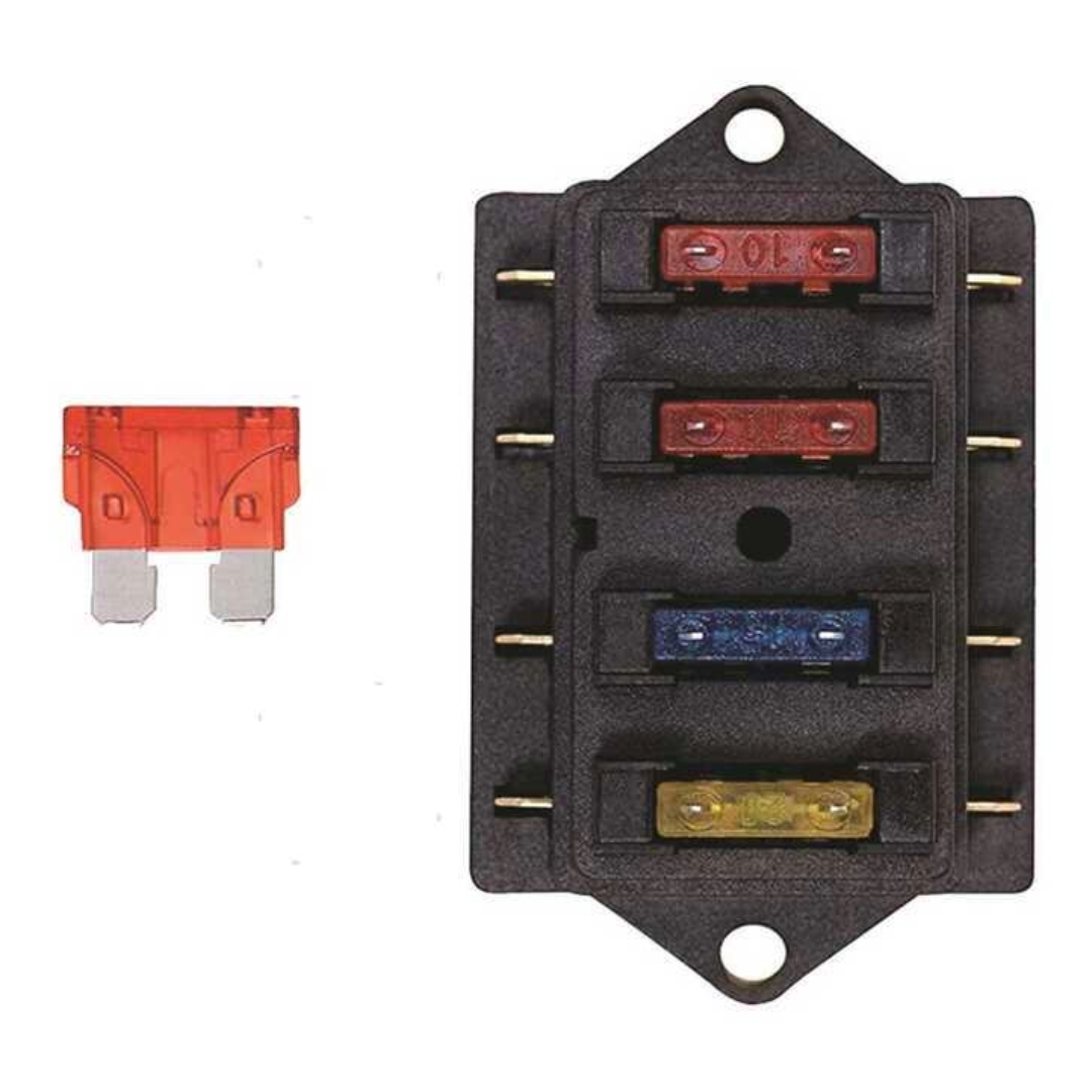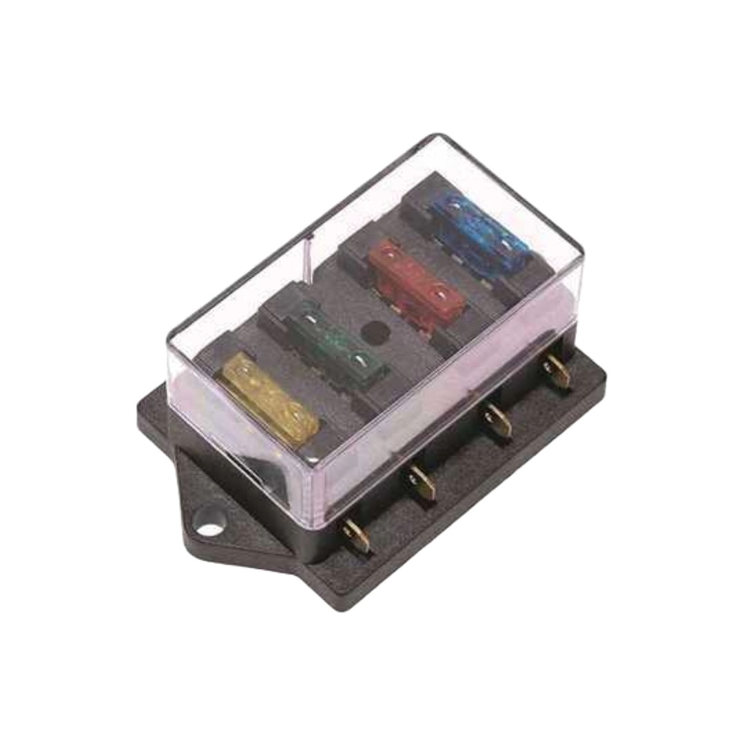 Scatola portafusibili a lama 4 posti faston impermeabile dotata di coperchio protettivo per fusibili Unival. Realizzata in ABS antiurto fiamma ritardante e con contatti in rame nichelato da 6,3 mm per una massima capacità di 40A.