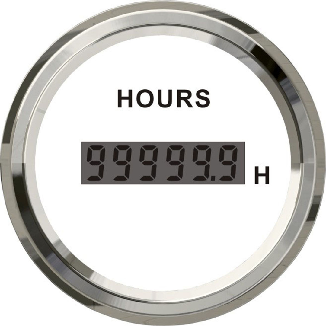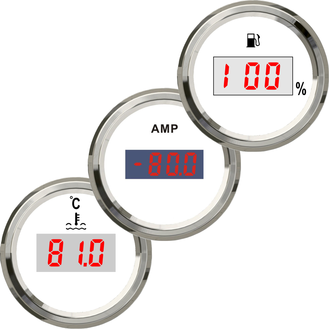 Indicatori TREM digitali serie premium "X-LINE" con quadrante bianco. Grado d'impermeabilità (stagno) IP67, corpo in tecnopolimero e lunetta quadrante in acciaio inox 316 diamantata lucida. Lente trasparanete anti-fog lucida. Retroilluminazione a LED 12/24V.