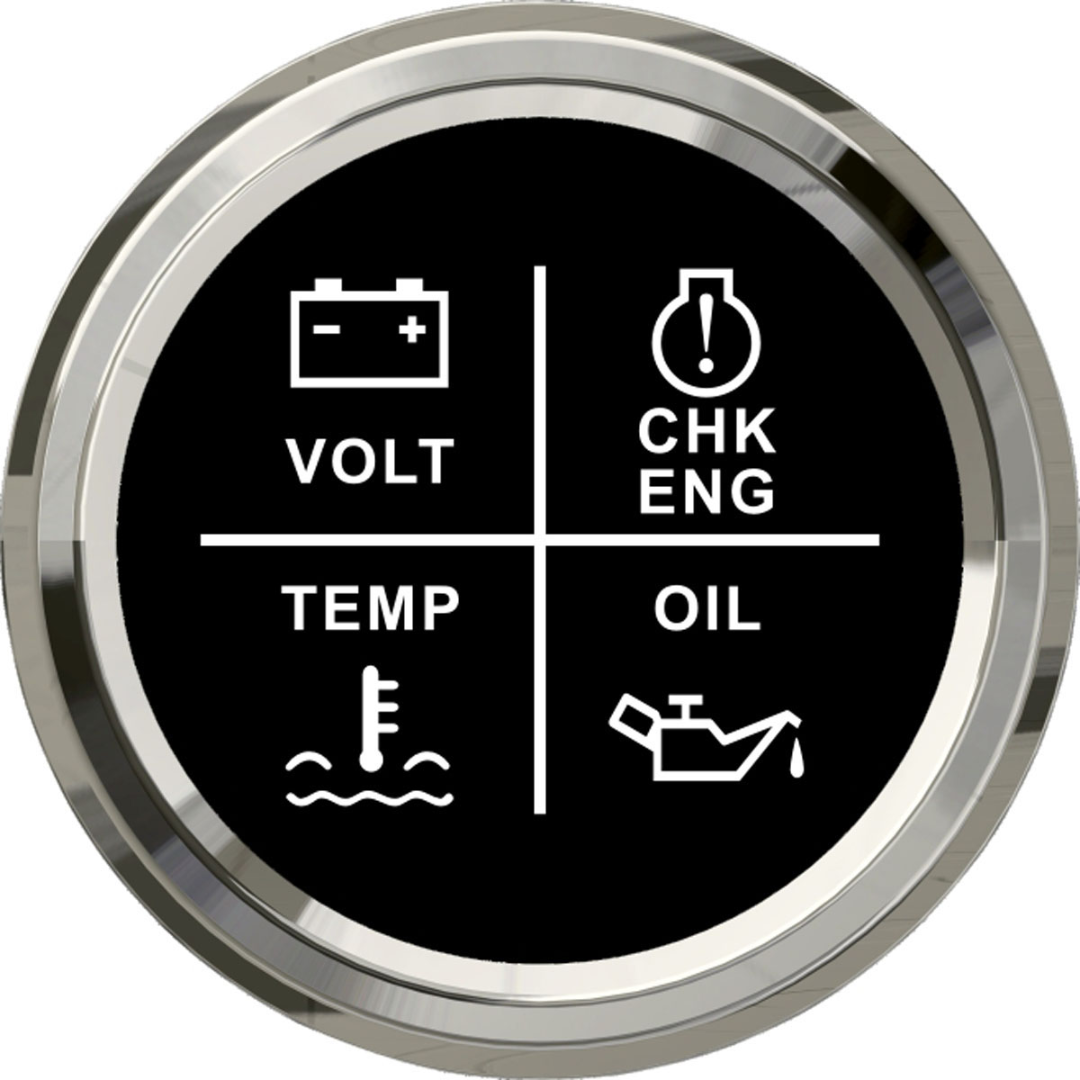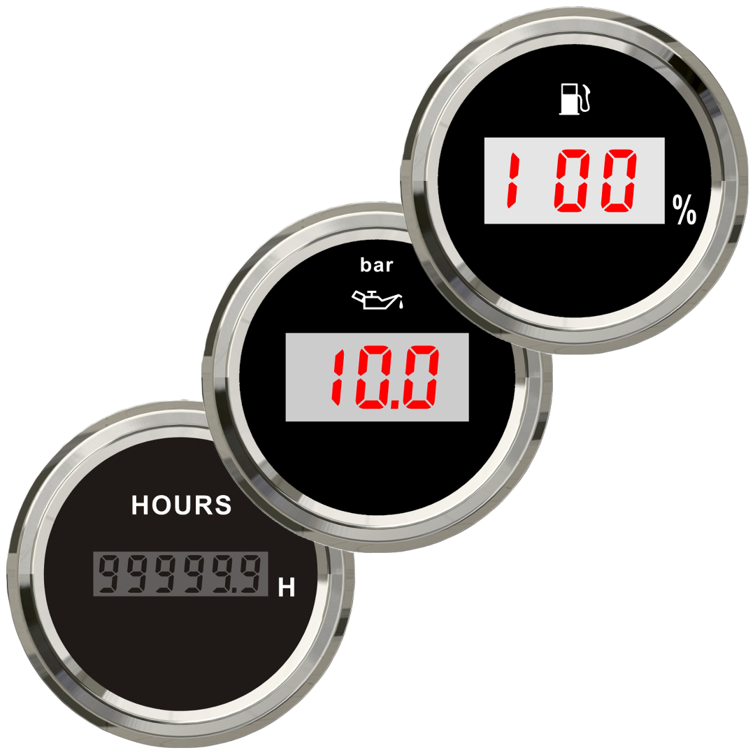 Indicatori TREM digitali serie premium "X-LINE" con quadrante nero. Grado d'impermeabilità (stagno) IP67, corpo in tecnopolimero e lunetta quadrante in acciaio inox 316 diamantata lucida. Lente trasparanete anti-fog lucida. Retroilluminazione a LED 12/24V.