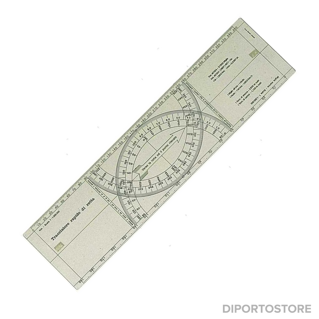 Strumento per carteggio nautico con riferimenti e misure per tracciamento di rotta su carta nautica. Con goniometro.
