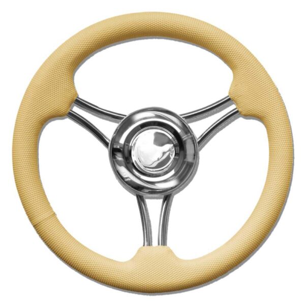 Volante a ruota con struttura in acciaio inox e rivestimento in poliuretano bianco, impugnatura antiscivolo resistente ai raggi uv e all'acqua salata, per uso nautico. Mozzo intercambiabile.
